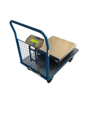 Mobile Plattformwaage fest auf einem Rollwagen montiert.