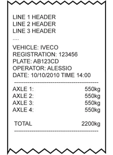 • Ausdruck komplett programmierbar mit Tastatur oder PC (mit Hilfe von DINITOOLS), mit dem Gewicht jeder einzelnen Achse und dem Gesamtgewicht des Fahrzeugs. 30 Druckformate können den verschiedenen Funktionen zugeordnet werden (Drucktaste, Summierung, Kundensummierung, Produktsummierung, Fahrzeugsummierung, Teilsummierung, Gesamtsummierung, Abschlußsummierung…). Jedes Druckformat kann 2048 Positionen enthalten; dies können direkte ASCII-Codes oder voreingestellte Druckblöcke sein (z.B. Firmenbezeichnung, fortlaufende Wägung und Partie, Netto, etc.).